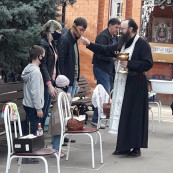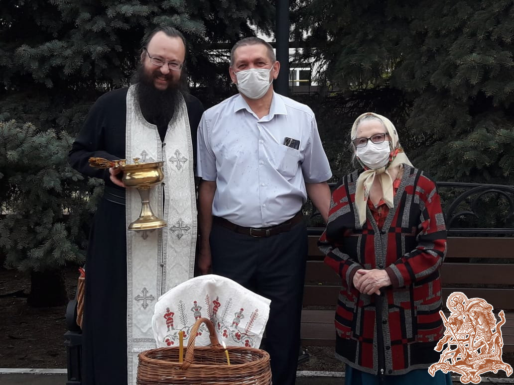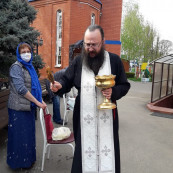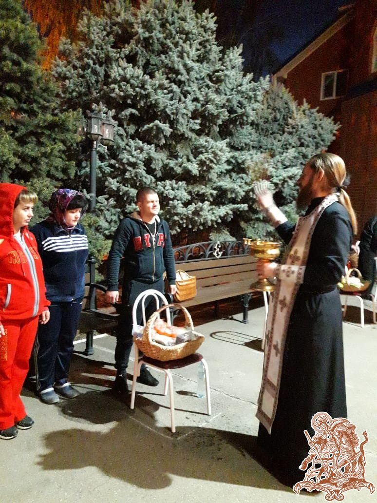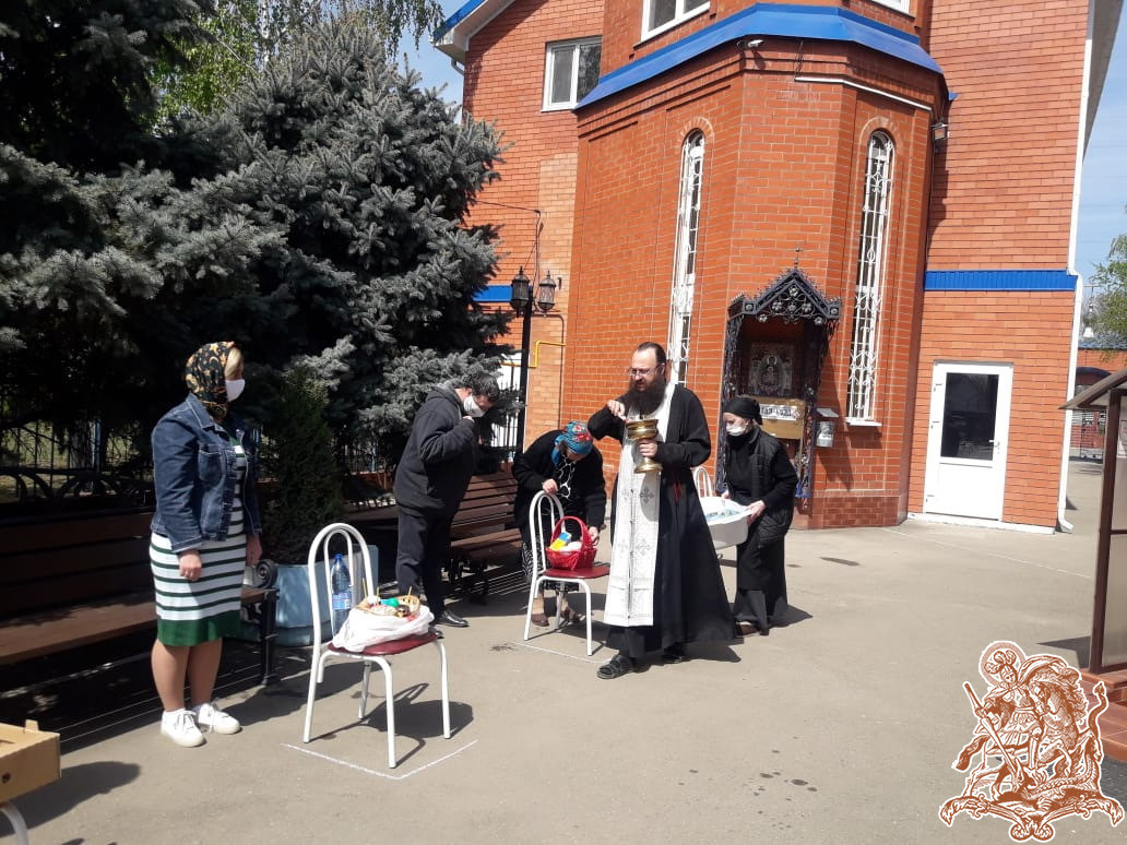 В Великую Субботу, что бы не создавать массовго скопления людей на территории Прихода были установлены стулья на безопасном расстоянии, а духовенство храма всю субботу без устали совершаило освящение куличей каждые 5-10 минут. Все Пасхальное богослужение было совершено на улице