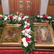 Перед началом службы отец Спиридон совершил водосвятный молебен. Божественную литургию возглавил благочинный Динского района протоиерей Иоанн Лобко, ему сослужили иеромонах Спиридон, иерей Сергий, а так же клирик Свято-Вознесенского храма станицы Пластуновской иерей Павел Максимец. По окончании богослужения был совершен Крестный ход и краткий молебен в верхнем приделе храма, после который отец Спиридон поздравил настоятеля храма и всех прихожан с Престольным праздником.