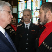 На сцене рядом со знаменем по традиции расположились старики, в президиуме - начальство и почетные гости, среди них первый заместитель атамана Кубанского казачьего войска казачий полковник Николай Перваков; атаман Екатеринодарского отдела ККВ Виктор Светличный; духовник Екатеринодарского районного казачьего общества отец Николай; глава города Владимир Евланов и первый заместитель председателя городской Думы Виктор Тимофеев.