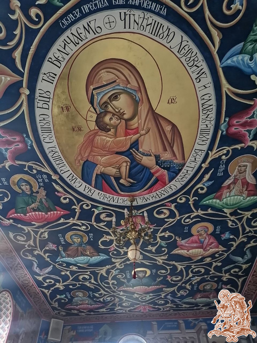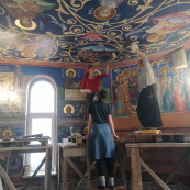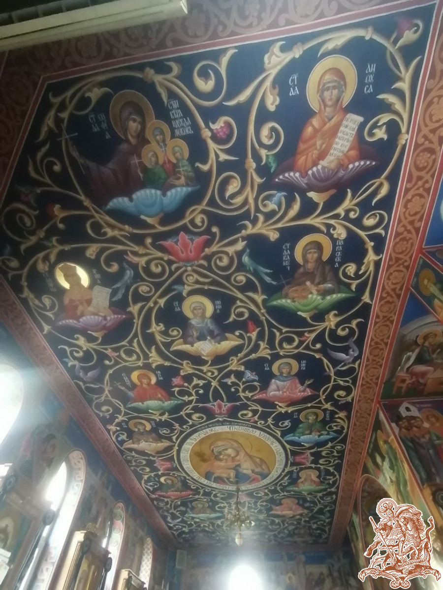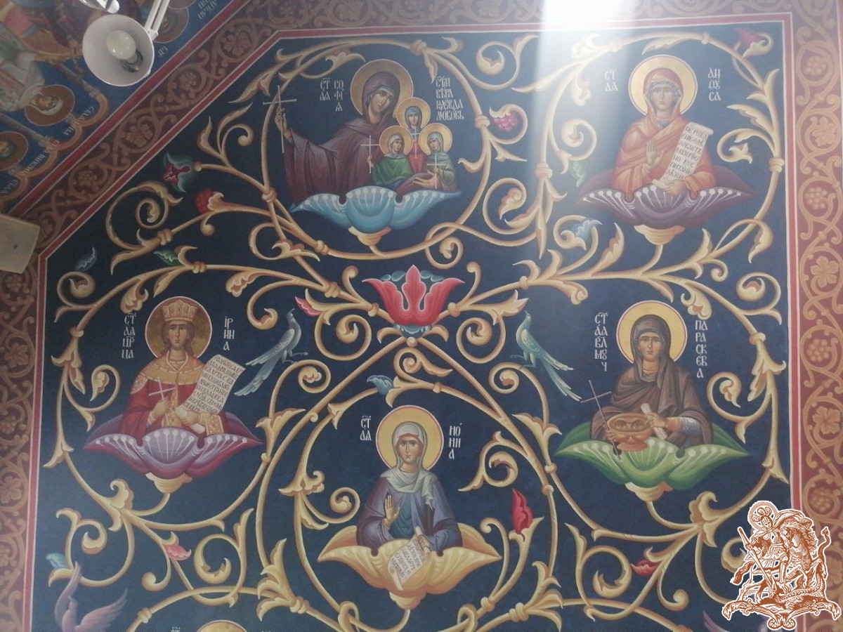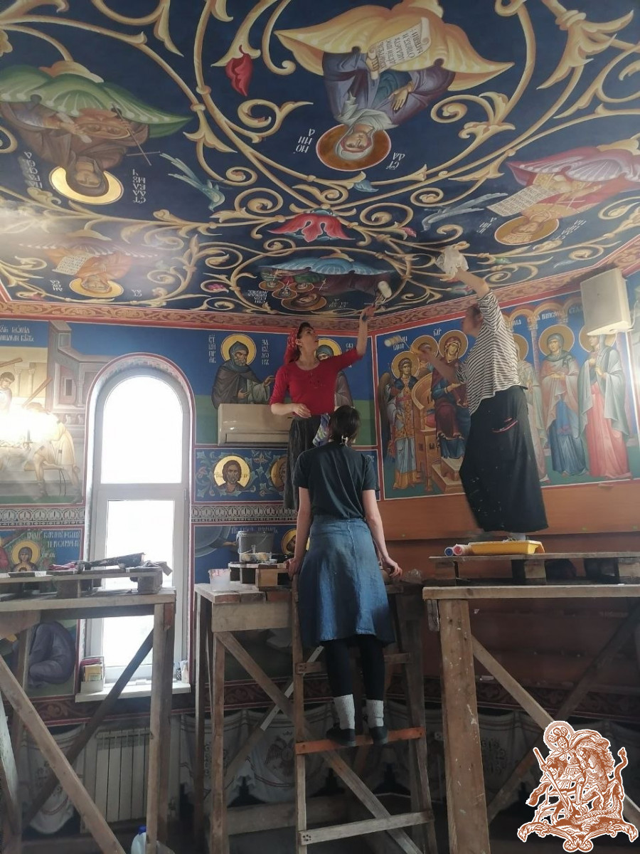 Милость Божией к празднику Святой Пасхи была завершена роспись потолка левого крыла храма. Сейчас готовятся эскизы для начала работ по росписи правого крыла. С надеждой и упованием смотря в будущее, надеемся на скорое завершение процесса росписи всего храма.