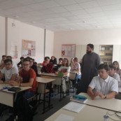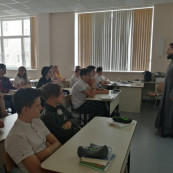 Отец Михаил встретился со старшекласниками, которые планируют принять участие в славлении Креста Христова и рассказал им об истории праздника, его значении, а так же важности самого события обретения Креста спустя 3 века после Евангельского повествования как первого археологоческого доказательства земной жизни Господа нашего Иисуса Христа.