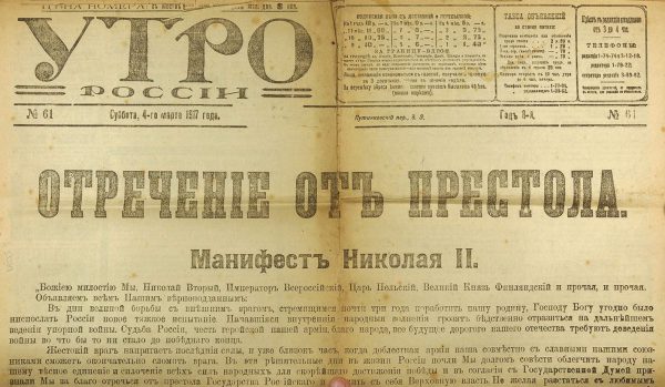 Первое и, очевидно, главное из всех событий обеих революций, важнейшее для понимания судеб России — отречение Николая II от престола, совершившееся 2/15 марта 1917 года.